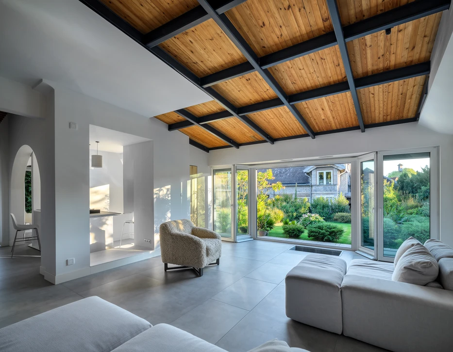 Espace de transition raffiné entre intérieur et extérieur, construit avec des matériaux robustes pour un usage confortable en toutes saisons.